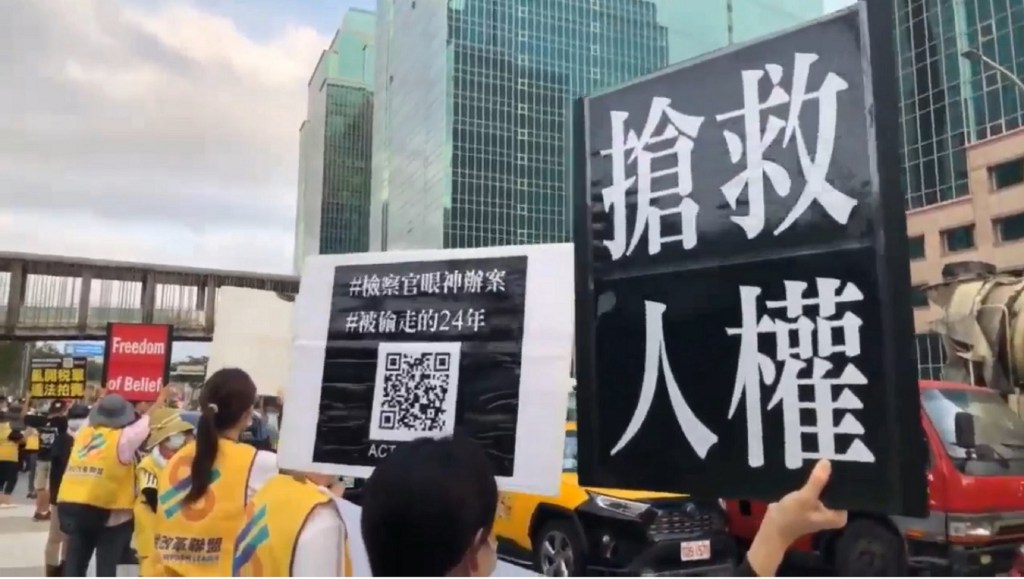 圖說1. 法稅改革聯盟、平反1219行動聯盟志工及聲援民眾,在汐止宏碁大樓外舉牌等待捷克參訪團,為太極門稅務冤案搶救人權。