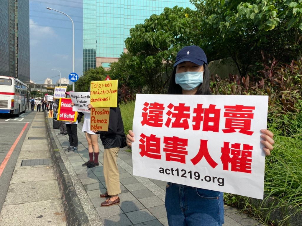 圖說2.太極門無欠稅,土地卻被執行署違法強行拍賣,聲援團體在宏碁汐止總部街頭舉牌,向捷克參訪團請求國際人權救援。