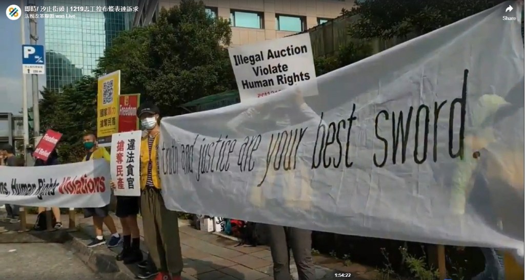 圖說3.平反1219行動聯盟志工透過直播,用中文、英文、捷克文標語及布條向國際發聲,控訴違法貪官用國家暴力搶奪民產!