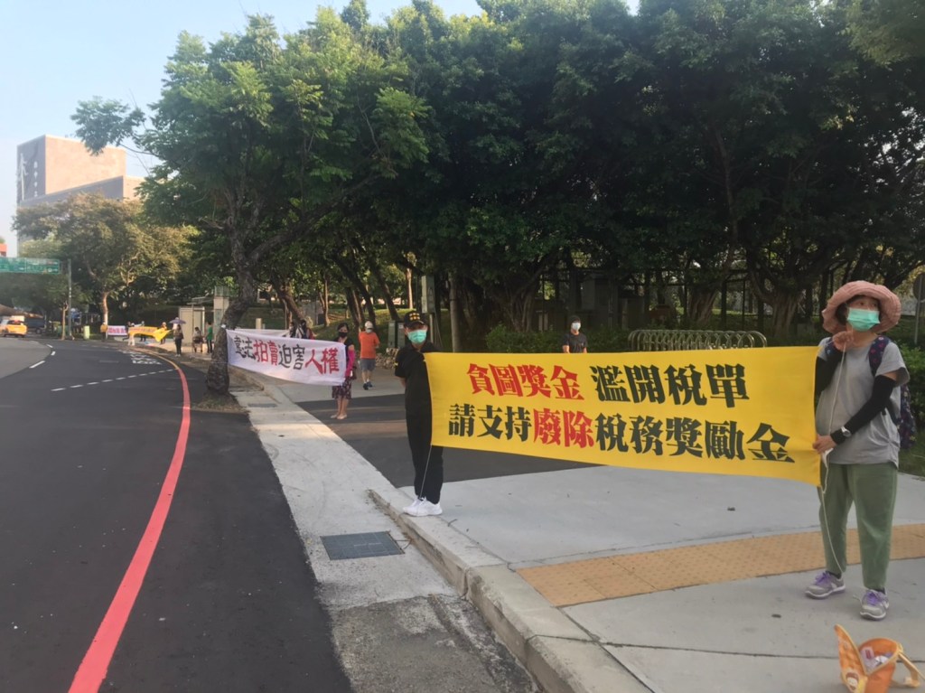 圖說二:志工於經國園道路旁表達希望廢除稅務獎勵金、廢除執行獎金。