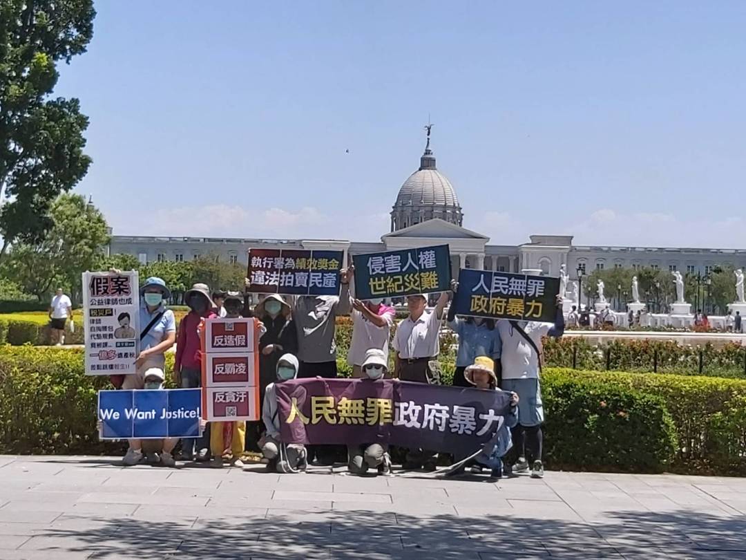 圖一、法稅改革志工與民眾在奇美博物館前舉牌陳情,表達人權遭政府迫害,希望蔡英文總統與全國律師代表們能聽到人民的冤屈。