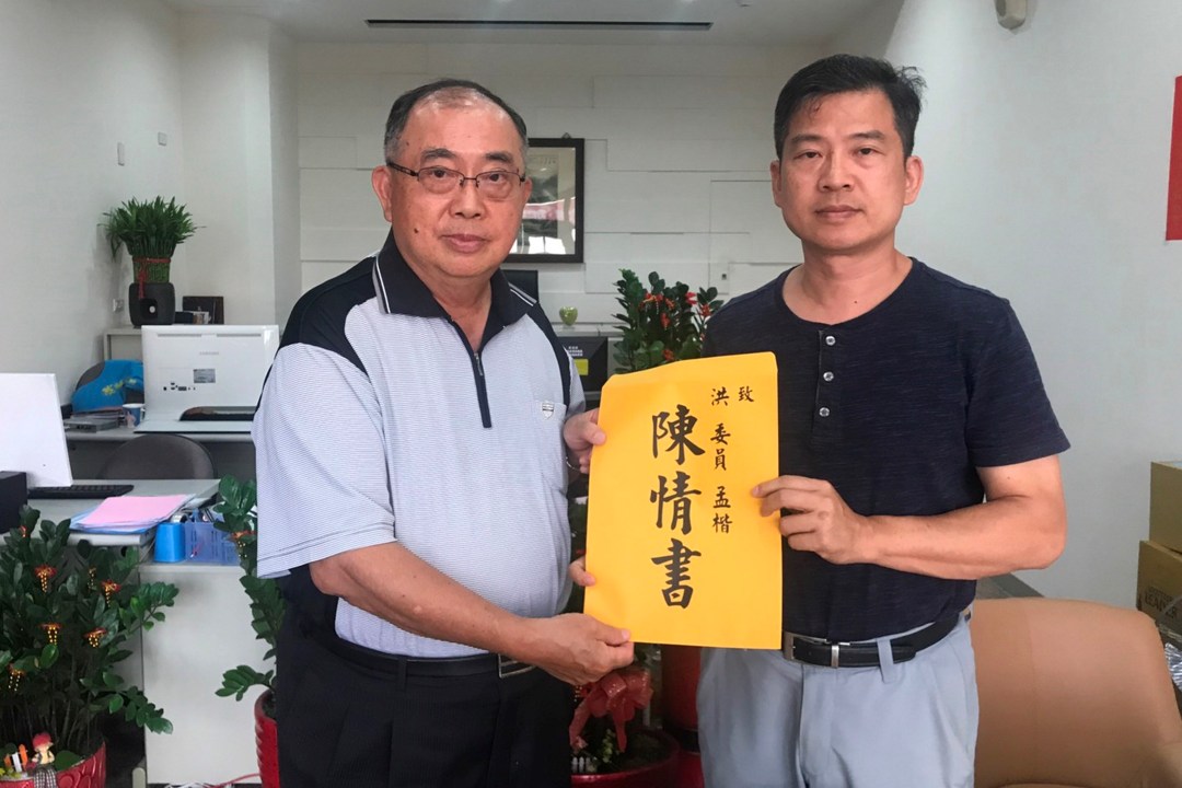 圖1:張耀文主任(右)代表洪孟楷委員收下太極門弟子代表的陳情書。