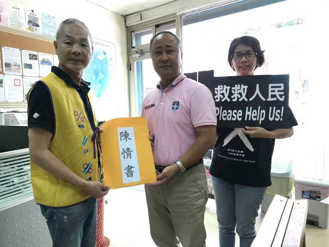 圖說:法稅改革聯盟志工和太極門弟子向桃園市議員徐玉樹陳情,秘書鍾耀民(中)代表接受陳情書。
