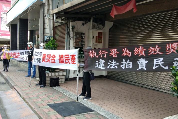 適逢週休假日,服務處與總聯絡處鐵門深鎖。民團志工們依然拉好陳情布條與舉牌,提醒來往民眾都要好好注意自己的荷包、注意自己的帳戶,因為國稅局與行政執行署隨時都會在無預警的情況下,將百姓帳戶中的財產強制執行。一位老太太站在布條前凝視許久,跟志工說:我剛剛才跟我兒子講,國稅局又來稅單了,有理的、無理的都要收,人民顧三餐都來不及了!課錯了,抗議也沒用、去告也都沒有用!志工回答,所以我們才會站在這裡,要請吳秉叡委員出來幫幫人民。