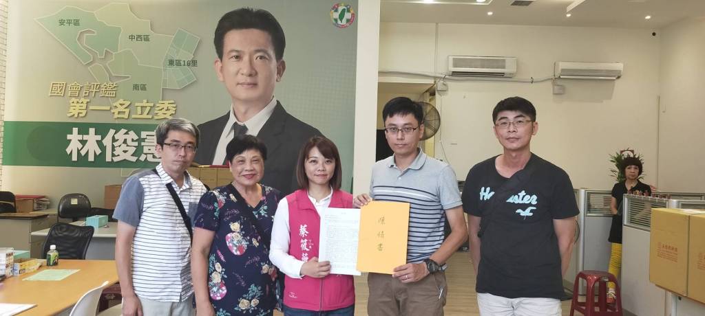 志工向台南市議員蔡筱薇及呂維胤陳情,希望可以協助停止政府迫害太極門的惡行,議員們表示了解並接下陳情書。