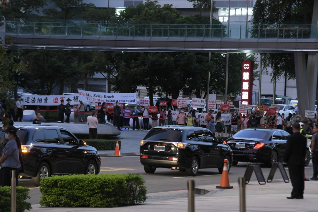 死豬不怕滾水燙?國稅局與行政執行署聯手,用公權力霸凌人民,搶奪太極門苗栗山區土地,迫害人權 24年,聲援民團再向美國國務次卿柯拉克告洋狀!平反1219行動聯盟與民團志工近50人,17日傍晚於大直萬豪酒店門口,高舉 「SOS Mr. Keith Krach Tai Ji Men being persecuted」「違法拍賣,迫害人權」「Unjust Tax Bills Illegal Auctions」等標語,並於車隊抵達酒店時,高喊「SOS!」向訪台的柯拉克控訴,台灣人權迫害24年的血淚事實,希望能喚醒蔡政府落實人權保障!