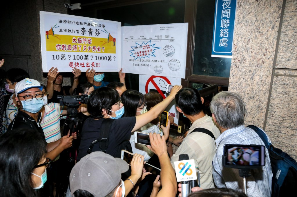 P3. 志工舉牌內容「行政執行署新竹分署主任執行官李貴芬,太極門案你到底領了多少獎金?10萬?100萬?1000萬?趕快吐出來!!!」