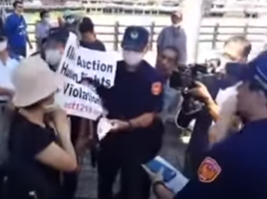 P5. 高雄女姓志工拿標語,就被警察給撕毁,A3大小的紙卡,只寫著中英文「違法拍賣 迫害人權」標語!(照片來源:網路影片https://youtu.be/G2zlacijkVw)