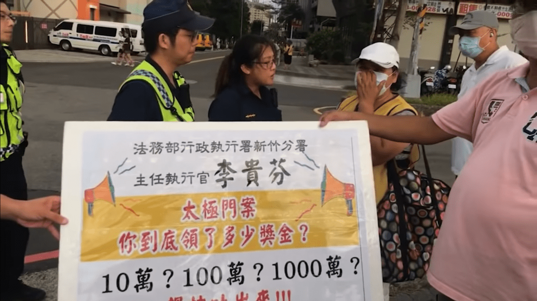 P3. 志工舉牌內容「行政執行署新竹分署主任執行官李貴芬,太極門案你到底領了多少獎金?10萬?100萬?1000萬?趕快吐出來!!!」