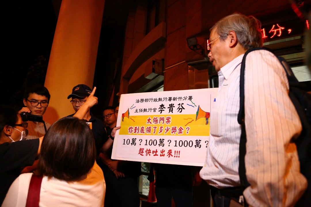 專攻行政法的教授曾建元指出,行政執行署拍賣人民財產有高額的績效獎金。而稅捐單位開稅單也長期被詬病有高額稅務獎勵金,而且這兩個獎金都是要點,皆是未通過立院審核的內部條文,而且每年都編列上億元獎金,因此法稅改革聯盟志工,長期在全國各地宣導法稅問題,更因為8月21日行政執行署拍賣太極門苗栗山區土地後,法盟志工在各地宣導,其中一個舉牌內容,就是詢問承辦該次拍賣的「法務部行政執行署新竹分署主任執行官李貴芬,太極門案你到底領了多少獎金?10萬?100萬?1000萬?趕快吐出來!!!」僅此一個疑問句,就讓警方違法逮捕手無寸鐵的老百姓,其中暴露種種檢警違法,令人咋舌!執行官拍賣領獎金是事實,本就可受公評,一個疑問句的牌子,就讓檢警大動作違法移送,甚至警局與行政執行署立刻發不實新聞稿,真的令人很難想像,號稱民主法治的台灣,公部門怎會發生這種事?!