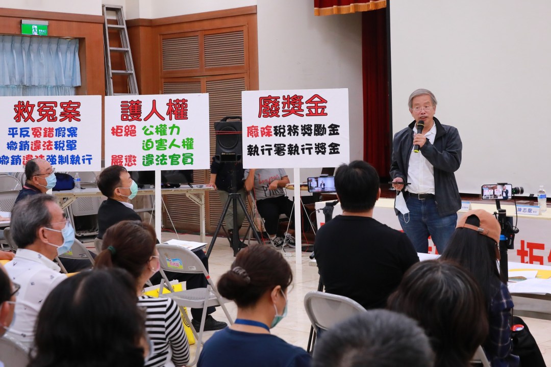 法稅改革聯盟指出,108年國稅局已將開出的5個年度的稅單(80、82-85)和敬師禮相關的部分都「更正為0」,但具備同樣事實的81年稅單,卻仍以「補習班」的名義去課稅。行政執行署明知違法,竟仍以無效稅單強行拍賣。學者專家爆料,國稅局及執行署明明知道太極門案是假案,為什麼甘冒違法風險要執行?因為這當中潛藏龐大的獎金利益,從24年前黑函的檢舉人、開單的國稅局到拍賣的行政執行署,經手的官員都有績效及獎金可以分。法盟志工在街頭宣導揭發奬金問題卻被捕,是否有背後既得利益者的計劃打壓,主辦單位呼籲全民一同來關注!