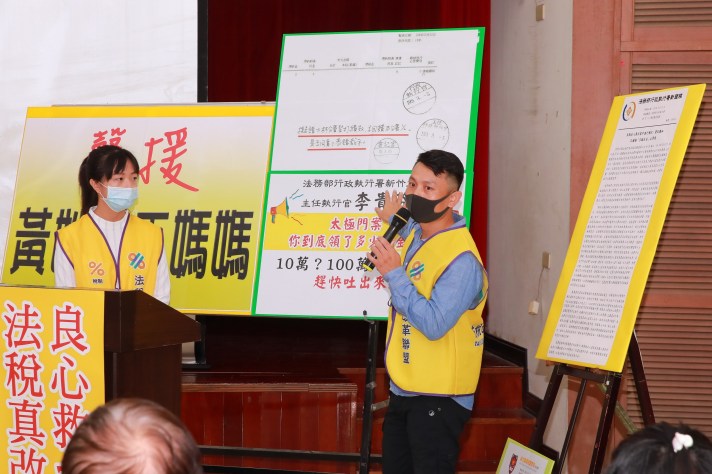 【記者黃昱宸/新北報導】震驚各界的「919竹北事件」,一位六旬志工媽媽手持海報站在大馬路邊聲援太極門,竟被警方當「現行犯」逮捕,不僅漏夜偵訊超過六個小時,更在深夜移送地檢署遭裁定限制住居。20日凌晨志工媽媽從地檢署出來,因驚嚇過度昏厥送醫!竹北事件引發各界質疑台灣還有言論自由嗎?!台灣人的人身自由保障在那裡?!10月13日(二)平反1219行動聯盟與法稅改革聯盟,於新北市泰山區楓樹福泰市民活動中心舉行記者會聲援志工媽媽,同時揭露警察執法過當背後的黑手及內幕。前台大法律系教授陳志龍、輔仁大學企管系助理教授魏賜聰,以及泰山區楓樹里林大筆、山腳里王國超、新明里李國裕等里長到場,與現場超過兩百位民眾共同關切這起人權迫害問題。現場還有網紅直播主進行直播。