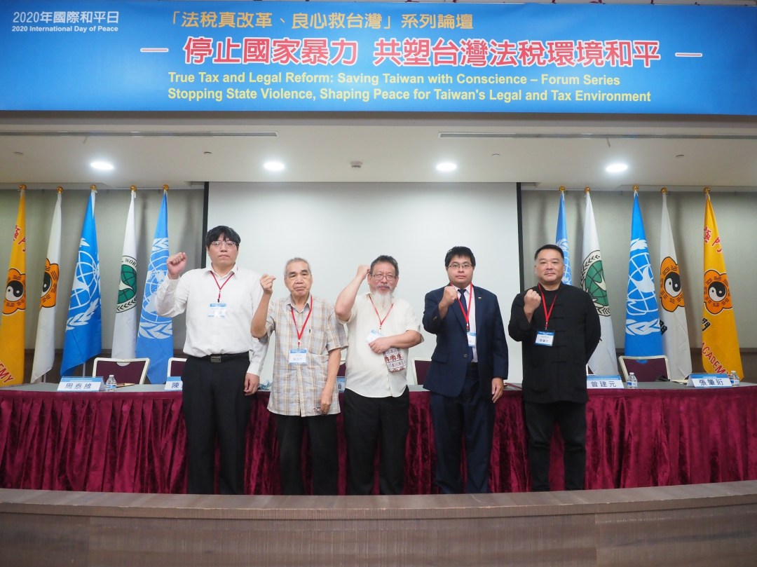 圖一:919竹北警察隨機非法逮捕志工事件,三十位專家學者在國際和平日「法稅真改革、良心救台灣」系列論壇上,嚴厲譴責並聲援。