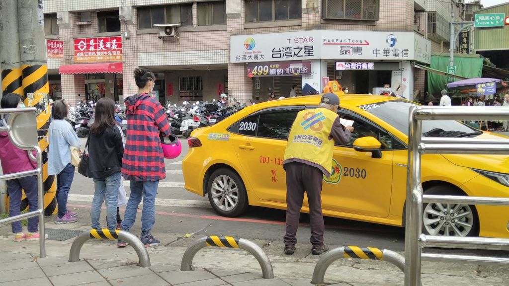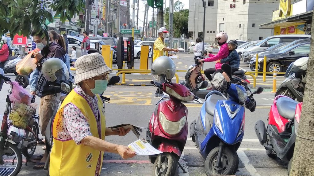 圖1. 法盟志工街頭宣導發傳單,呼籲大家一起加油,希望不要再有人受害。