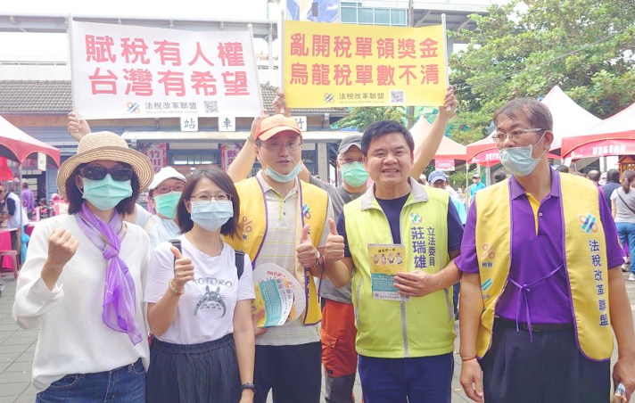 圖二:立委莊瑞雄(右二)與法稅改革聯盟志工合影。