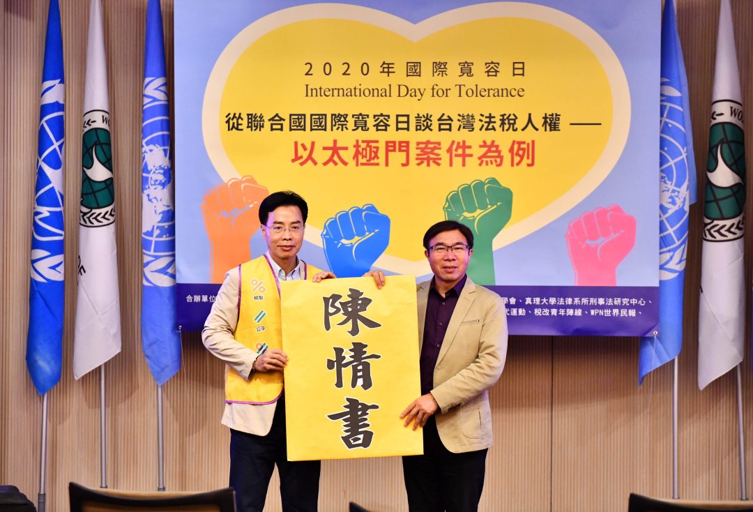 「Who is 萊爾(Liar)?」當最大說謊家是來自國家,台灣人權立國形象嚴重掉漆?11月16日 (一)為聯合國國際寬容日,當天下午在文化大學推廣教育部,聯合國/NGO世界公民總會、臺灣財經刑法研究學會、真理大學法律系所刑事法研究中心、法稅改革聯盟等十二個民團舉辦「從聯合國國際寬容日談台灣法稅人權-以太極門案為例」論壇。前台南縣長蘇煥智律師、前台大教授陳志龍、前陽明大學醫學教授郭正典、德國歐斯納布魯克大學駐台教授連福隆、前台大法學院副院長邱榮舉、台灣北社理事暨國際組召集人暨台灣人權文化協會理事長吳進生、輔仁大學企管系教授魏賜聰、消防署危害物災防專家顧問劉明哲、台北市議員張茂楠、徐弘庭,大安文山區主任梁文貴、新北市市長侯友宜顧問王至芬、前高雄國稅局簡任稽核黃坤光、及多位專家學者、民代、里長都到場聲援。與會人士手拿象徵「寬容」的心型舉牌,及做出和平鴿手勢表達力挺所有遭到公權力侵害的受害者,呼籲政府落實轉型正義,嚴懲違法官員,訴求:1.救冤案; 2.護人權 ;3.廢獎金。