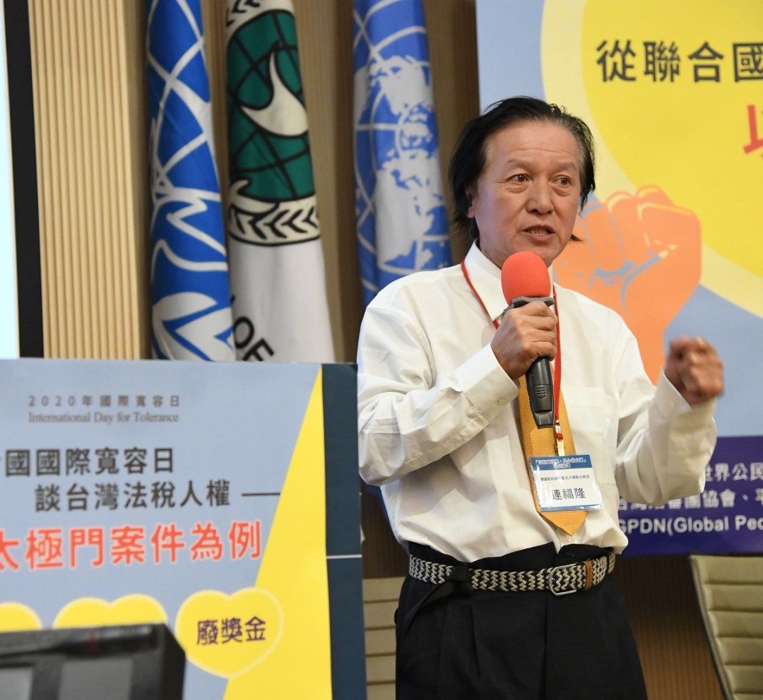 11月16日為聯合國國際寬容日,在文化大學國際會議廳進行一場「從聯合國國際寬容日談台灣法稅人權—以太極門案件為例」論壇。德國歐斯納布魯克(Osnabrück)大學駐台教授連福隆表示, 8月29日大法官許宗力宣告「不當黨產條例」合憲;10月沒收農田水利會千億財產都沒有經過司法的審查,均違反國際兩公約;8月21日太極門土地遭行政執行署違法拍賣流標後收歸國有,這些行為讓台灣名正言順地變成強盜國家。