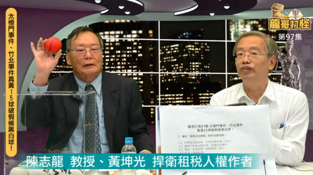 圖三:黃坤光(左)於網路節目龍哥打怪97集「發現良心,課稅應依法有據」中表示,行政機關應仁民愛物。