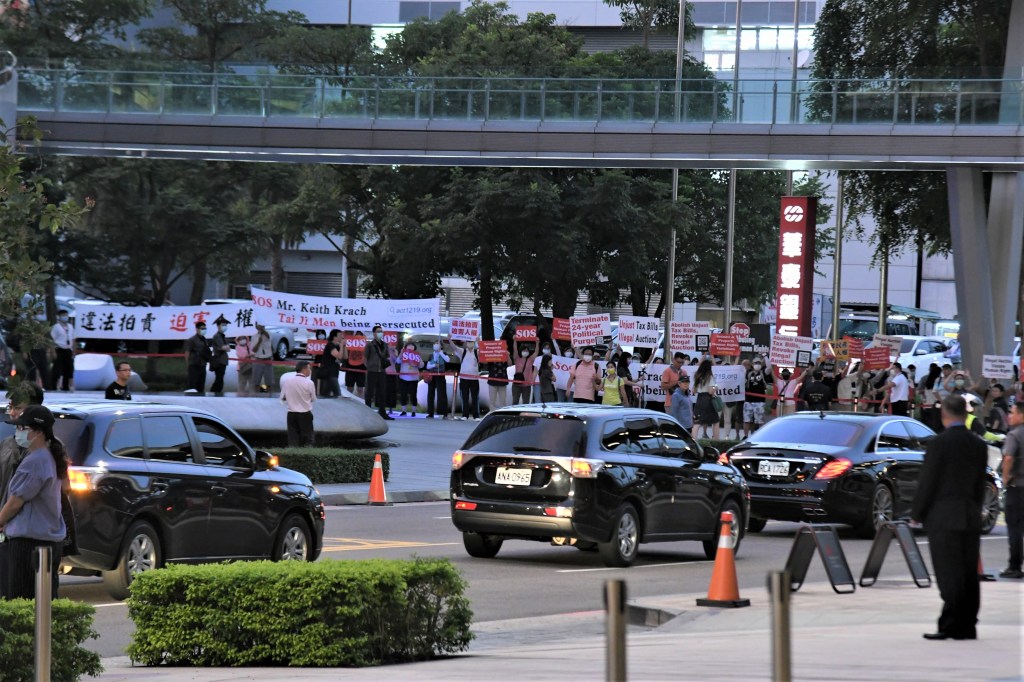 P2:捷克參議院議長韋德齊來台訪問,聲援太極門稅案人士在經過路邊舉牌。