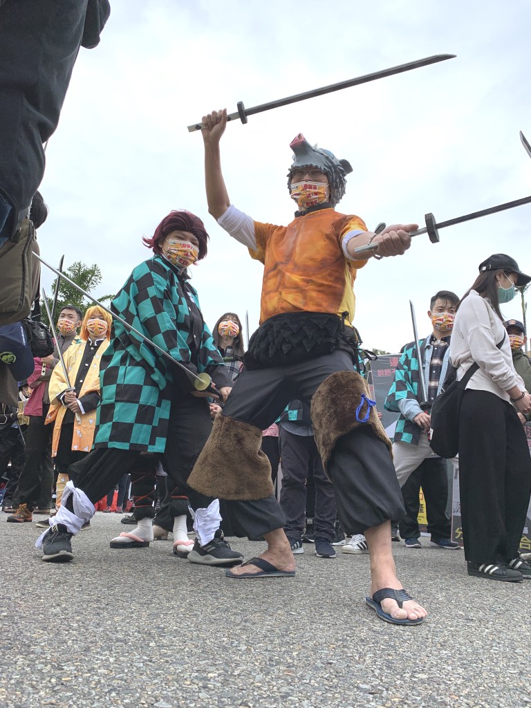 圖二:遊行隊伍中扮演為不公不義挺身而出的鬼殺隊的周先生表示,好人的沈默只會助長壞人的囂張,人權跟正義要靠自己爭取!