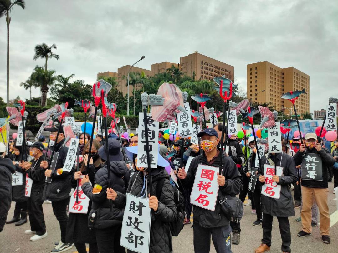 遊行民眾有的手持刀叉,上面刺著魚或肉,身上掛著財政部、國稅局、執行署的牌子,諷刺沒有人權觀念的違法官員以公權力迫害人民、魚肉百姓!已經擔任10年法稅志工的張小姐說,遇到過許多受災戶來投訴,像是基隆陳青旭先生欠1.8萬的交通罰鍰,行政執行署偽造文書把他250萬的祖厝以135萬賣了。今年到11月底,執行署新增欠稅欠費案已超過1,400萬件,當中不知有多少是充滿辛酸血淚的受災故事?