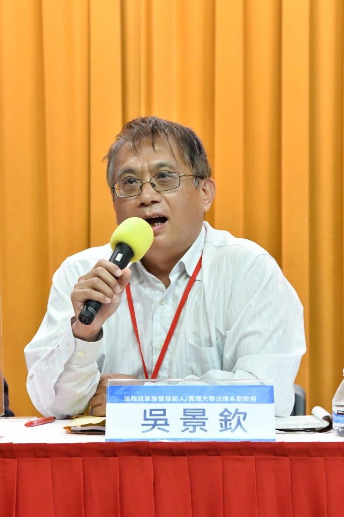 真理大學法律系副教授暨法稅改革聯盟發起人吳景欽指出,轉型正義就是要糾正、究責,太極門81年度綜所稅案很明顯錯判,依現行制度只能再審,但限制很多,五年就不能聲請再審,根本不合理,而目前冤錯假案要糾正非常困難,機率幾乎為零。他再談到濫權追訴罪的被害人認定,應該就是被告,但法院卻說沒有被害人;懲戒時效為十年,最高法院居然以檢察官起訴日起算,應該從判決確定時間起算才對。