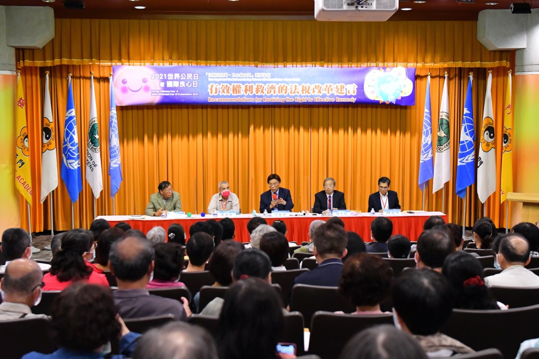 圖一:由聯合國/NGO世界公民總會、臺灣財經刑法研究學會等共25個民團,在台大應力館國際會議廳聯合舉辦「法稅真改革 良心救台灣」系列論壇。