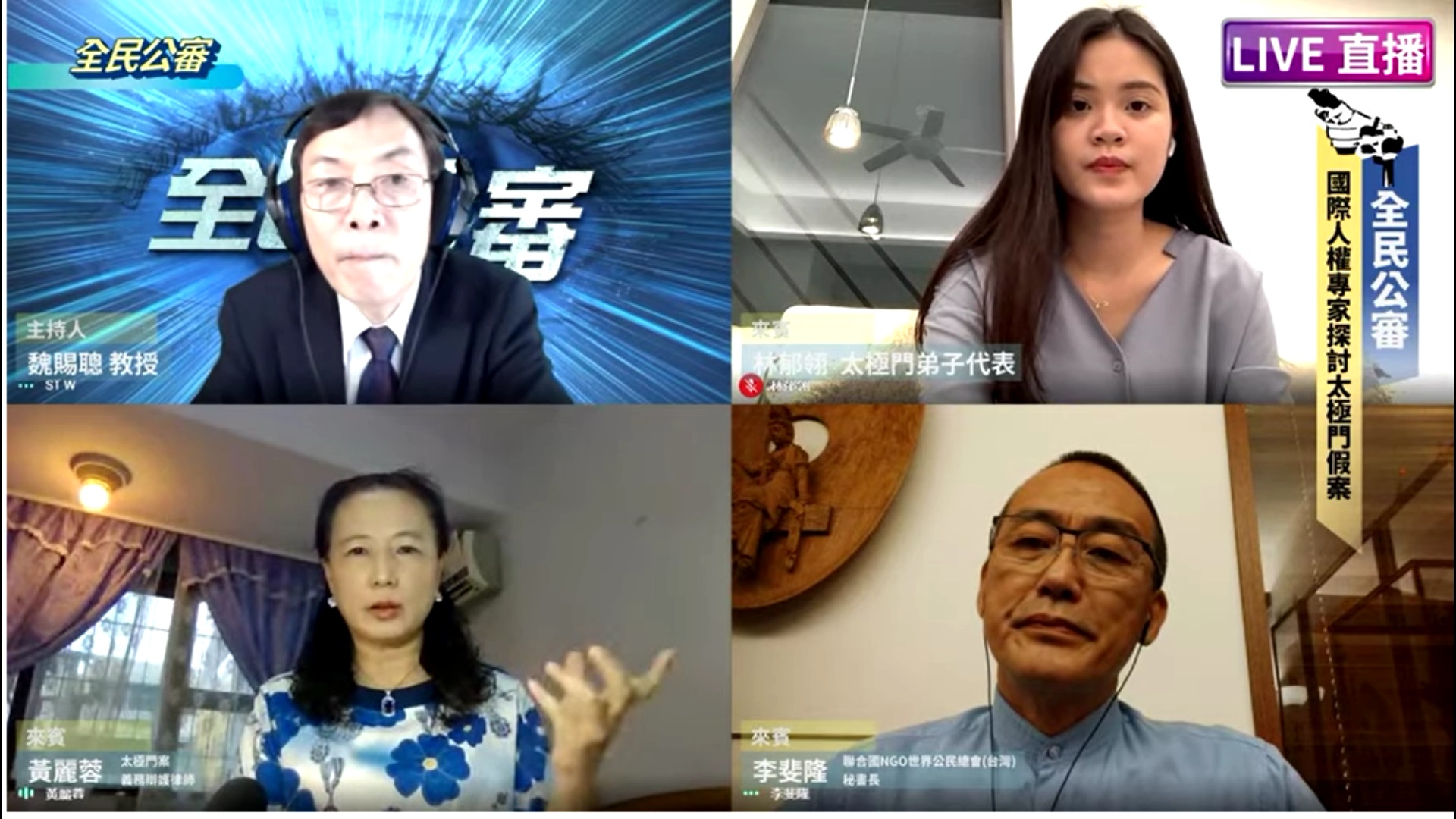 【記者張耘心綜合報導】網路直播「全民公審」節目,6月13日主題為「國際人權專家探討太極門假案」,https://www.youtube.com/watch?v=SgpnQfwMx7A,本集邀請聯合國/NGO世界公民總會(台灣)祕書長李斐隆、太極門案義務辯護律師黃麗蓉、太極門弟子代表林郁翎,一起剖析被公認為遭受國家的暴力迫害長達25年並且引起國際人權組織關切的「太極門假案」。李斐隆表示,目前有多位國際級學者專家,針對此案發表多方觀點與建議,國內外報章雜誌也持續刊登報導,更有無數國際友人不斷關注,太極門人權迫害案件已成國際矚目的案件。他提到,義大利宗教學者Dr. Massimo Introvigne即曾表示,太極門案突顯台灣表裡不一,台灣自稱是保護宗教信仰非常重要的民主聖地,但居然看到太極門案件延續了二十幾年。