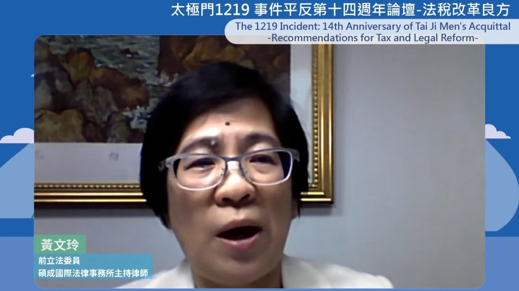 前立法委員、碩成國際法律事務所主持律師黃文玲談到,「人生有多少25年,它佔了人生至少1/3以上」,太極門是稅法的照妖鏡,稅務改革應以太極門為例作修正,才能保障納稅人權益。她談到,當時太極門案行政救濟已經被撤銷,可是行政機關卻重複做出處分,造成稅單一直開,拖了20幾年變成萬年稅單沒有辦法解決,她進一步提到太極門81年度的稅單應該要主動更正,但行政機關沒有擔當,造成冤案一直沒辦法平反。如果修法沒辦法站在人民立場,萬年稅單沒有辦法解決,納稅義務人的退稅請求權沒有辦法解決,如何保障人民財產權?她呼籲立法諸公,要站在人民的立場把關修法。稅務獎金是造成稅務冤案,「81年被執行是否與稅務獎金有關?應該好好思考。」期待未來修法,如果行政官員有做違法的處分,應該要處以相當罰則或者處罰,稅務機關才會有所警惕。