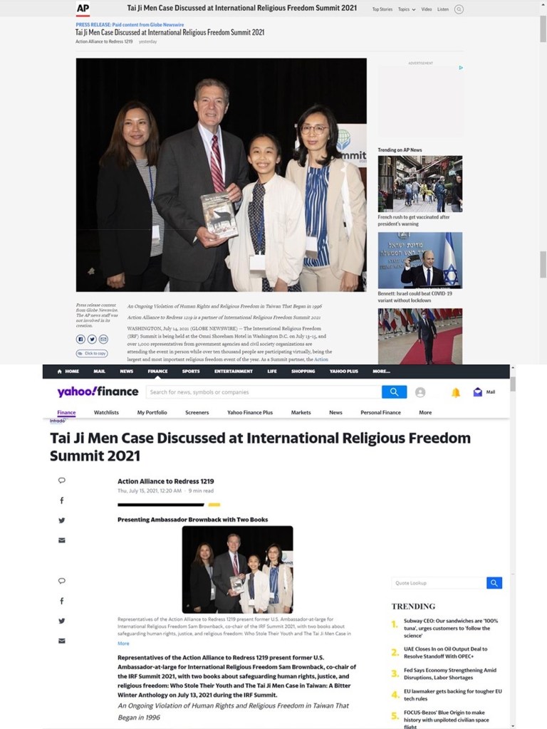 【記者張美都/台北報導】日前美國國務院發布的「2020年國際宗教自由報告」當中,肯定台灣宗教自由表現,我外交部也表達願意捍衛全球宗教自由免於威權主義侵害的決心。而事實上,在台灣一宗遭到信仰自由與人權迫害長達25年的案件,正引起國際高度重視。7月13日由前美國國際宗教信仰自由無任所大使Sam Brownback 和 Lantos 人權基金會主席 Katrina Lantos Swett 博士共同主辦的2021年國際宗教信仰自由高峰會(IRF)在華盛頓特區舉行。來自政府機構和民間組織近千名代表參加,同時有上萬人在全球各地透過線上會議參與。此次高峰會合作夥伴平反1219行動聯盟特別舉辦一場「攸關正義的問題:太極門案」研討會,探討這樁發生在台灣的人權迫害案件,並登上《美聯社》、南韓新聞、Yahoo等多家國際媒體頭版頭條!