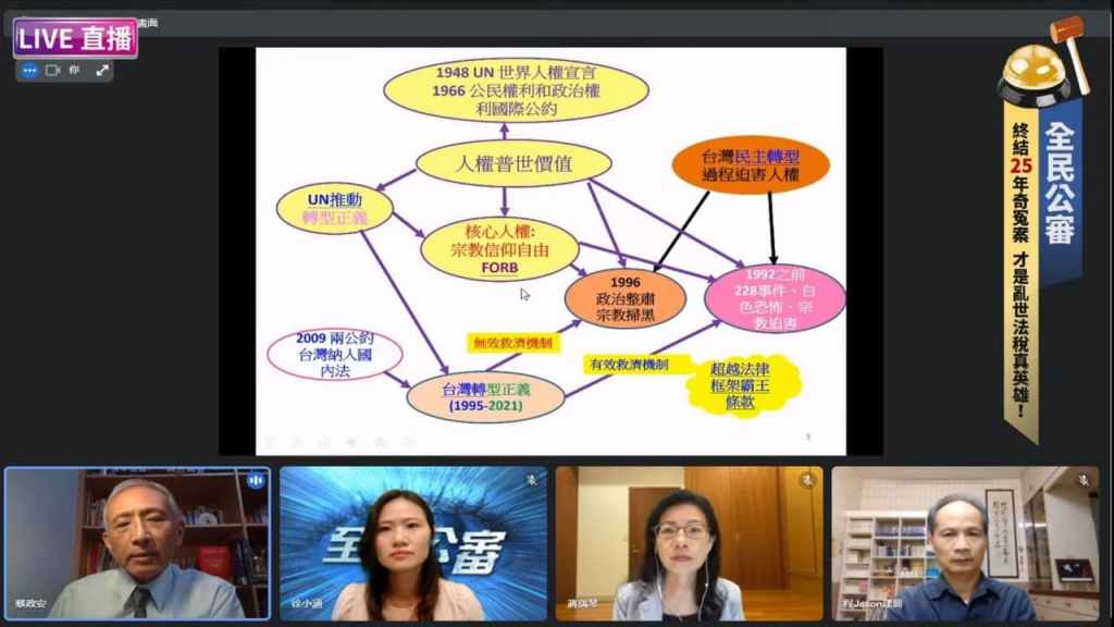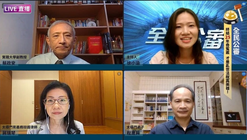 【記者張耘心報導】遲來的正義非正義;當政府聽不到人民的聲音時,唯有全民覺醒,方能捍衛自身權利。7月11日線上直播節目「全民公審」播出主題為「終結25年奇冤案才是亂世法稅真英雄!」https://www.youtube.com/watch?v=WLnTuK_HE9Y ,節目中邀請太極門弟子程建興、實踐大學副教授蔡政安及太極門案義務辯護律師蔣瑞琴探討長達25年的稅法奇冤案。主持人徐小涵表示,被專家學者喻為法稅史上228事件的太極門案,在2007年7月13日已獲最高法院判決無罪、無欠稅確定,但是國稅局及行政執行署漠視法院判決,在去年強行將太極門師徒的修行聖地違法拍賣、收歸國有,引起國內外許多專家學者的聲援與撻伐,越來越多國際人權組織關注此案,呼籲台灣政府要修正過往錯誤,儘速平反太極門假案。
