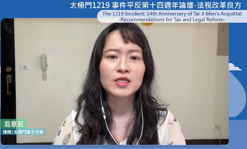 翁意茹表示,太極門是承傳道家心源的氣功武術修行門派,自古以來皆以師徒代代相傳,發揚太極門文化,致力於弘揚中華武學精神。民國85年無端受到政府宗教掃黑牽連,當時侯寬仁檢察官僅憑不實檢舉,即濫權違法搜索太極門道館,並製造假證人、假證據,羅織詐欺及逃漏稅捐的罪名,提起公訴,甚至還把案件移送國稅局違法課稅;國稅局也違反正當法律程序及行政程序正義,不僅未依職權調查、未待刑案判決確定所得性質,甚至隱匿證物,亦未給當事人陳述的機會,僅憑檢察官所捏造之不實的起訴書內容,就針對80-85年6個年度發單課稅並重罰,導致了這一場長達25年、受害人數眾多的嚴重文化摧殘,以及迫害宗教信仰自由之人權悲劇。 翁意茹表示,歷時25年的太極門事件,三審判決確定無詐欺、無漏稅、無違反稅捐稽徵法,也認定了弟子敬呈給師父的敬師禮屬贈與的性質,依法是免稅的所得,弟子之間的代辦行為也不是營利販售,和師父師母沒有任何的關係。翁意茹指出,真相早已大白,法理情均明。政府唯有坦誠面對錯誤及勇敢除錯,撤銷違法稅單,返還違法拍賣之太極門修行道場預定地,平反冤案,落實轉型正義,才能讓失序的公權力回歸正軌,重建司法威信,恢復人民對政府的信任。