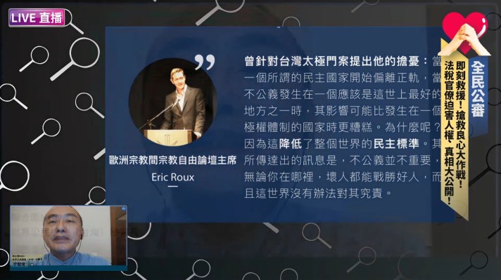 【記者周瑞雨/報導】延宕25年的太極門人權迫害案件,除了凝聚國內學者專家共同推動台灣的法稅改革之外,也得到許多國際人士的聲援,共同關注在民主台灣殘留的威權體制餘毒。8月8日全民公審節目中https://youtu.be/3LCKi2xjue0,真理大學宗教文化與資訊管理學系教授張家麟指出,太極門多年來堅持正義鍥而不捨,掌門人洪博士用愛、良心與正義來回應政府的不公義,以和平、據理力爭的方式,得到國際認同,雖然太極門曾經被污名化,但是經過多年的堅持,太極門證明了自己是一個值得尊重的門派,令人感動,國際人士也會長期支持太極門。