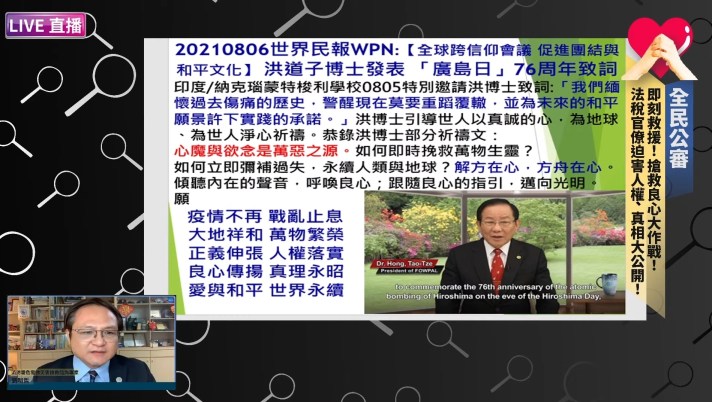消防署危害物災害搶救諮詢專家劉明哲博士分享,8月6日廣島原爆76周年紀念,太極門掌門人洪道子博士特別發表一篇演說指出,我們緬懷過去傷痛的歷史,警醒現在莫要重蹈覆轍,並為未來的和平願景許下實踐的承諾。並強調:「在不平安的世界現況中,唯有人類最珍貴的愛與良心,能夠撫平傷痛;能夠鼓舞希望;能夠轉動未來;能夠創造和平。」