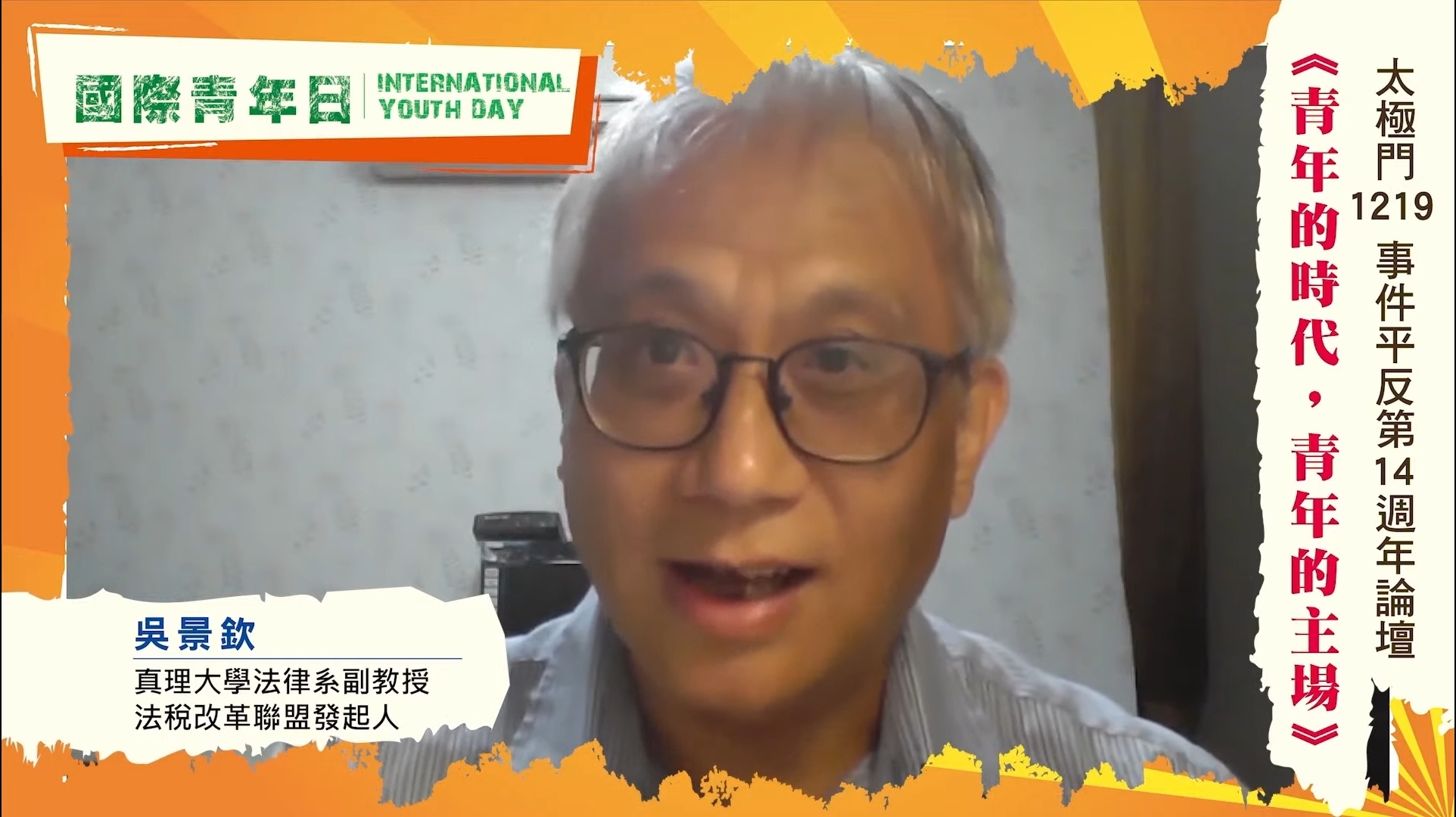 (記者黃大成 台北報導)青年世代擁有不受舊有習氣汙染的純真理想,在混亂的法稅舊規陋習中仍懷抱改革理想,8月12日是國際青年日,由聯合國/NGO世界公民總會、WPN世界民報、法稅改革聯盟等團體,舉辦「國際青年日:太極門1219事件平反第14週年論壇─青年的時代,青年的主場」(https://youtu.be/JNpf3mwRLyI ) 線上論壇,邀請專家學者與青年與談,第二場論壇主持人真理大學法律系副教授暨法稅改革聯盟發起人吳景欽表示,太極門案是司法稅法的照妖鏡,延宕至今25年沒有結束,面對外國學者都不敢開口說,台灣已簽署國際人權兩公約。稅法要走上法治,不能人治,台灣青年才有希望。