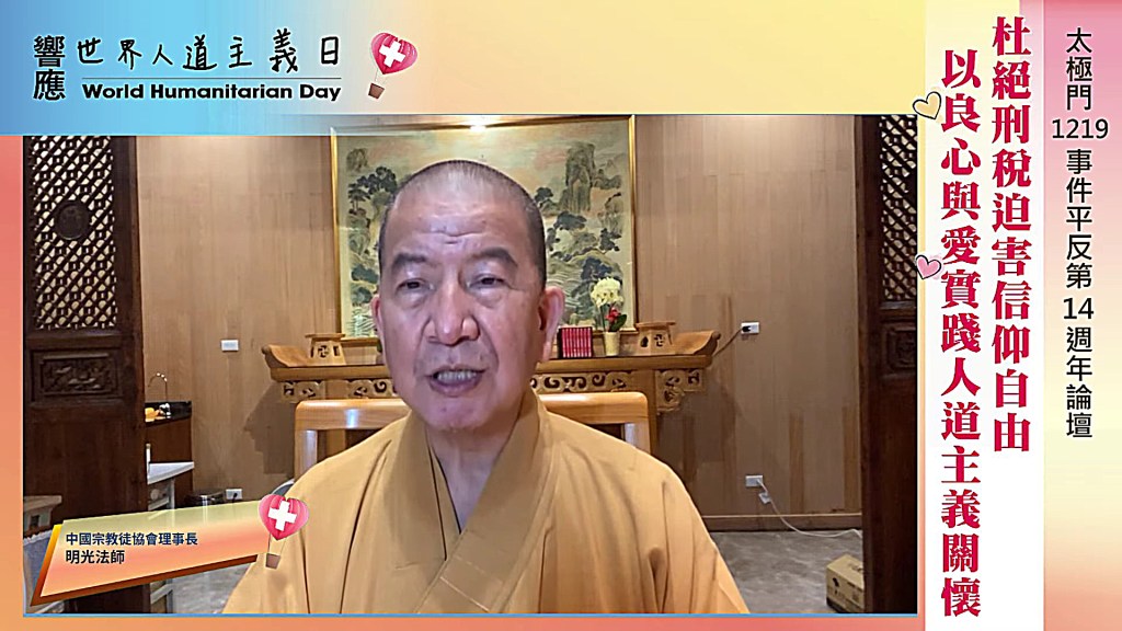 中國宗教徒協會理事長明光法師表示,在現今社會中,五倫關係圓滿是人道主義精神的實現,但必須站在人權的基礎上,而民主社會沒有君臣,只有政府與人民,人民是頭家,政府執政應以民為本,創造國人福祉為目的,在歷次參加法稅論壇中看到許多專家學者挺身為正義發聲令人感動敬佩,實不忍太極門師徒受宗教信仰自由迫害長達25年,仍無法脫離苦難,更不忍許多修道的善緣被耽誤。為化解沖天的冤屈,洗滌痛苦的靈魂,有錯須改,善莫大焉。政府必須依法保障人民的宗教信仰自由,停止迫害人權,專家稱為台灣法稅照妖鏡,根源就是宗教信仰自由的迫害,如今事理、法理俱明,行政機關應撤銷違法稅單,把修行道場土地歸還給太極門師徒,停止迫害人民,25年前造的惡業,不應再將錯就錯,否則將會危害國家法治,動搖國家根本,慎之慎之。