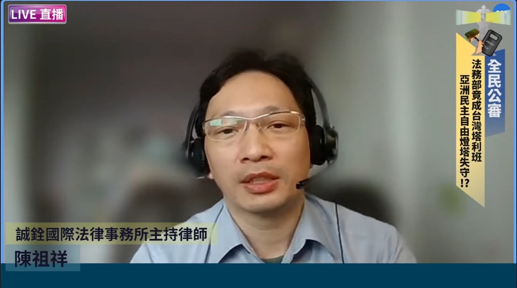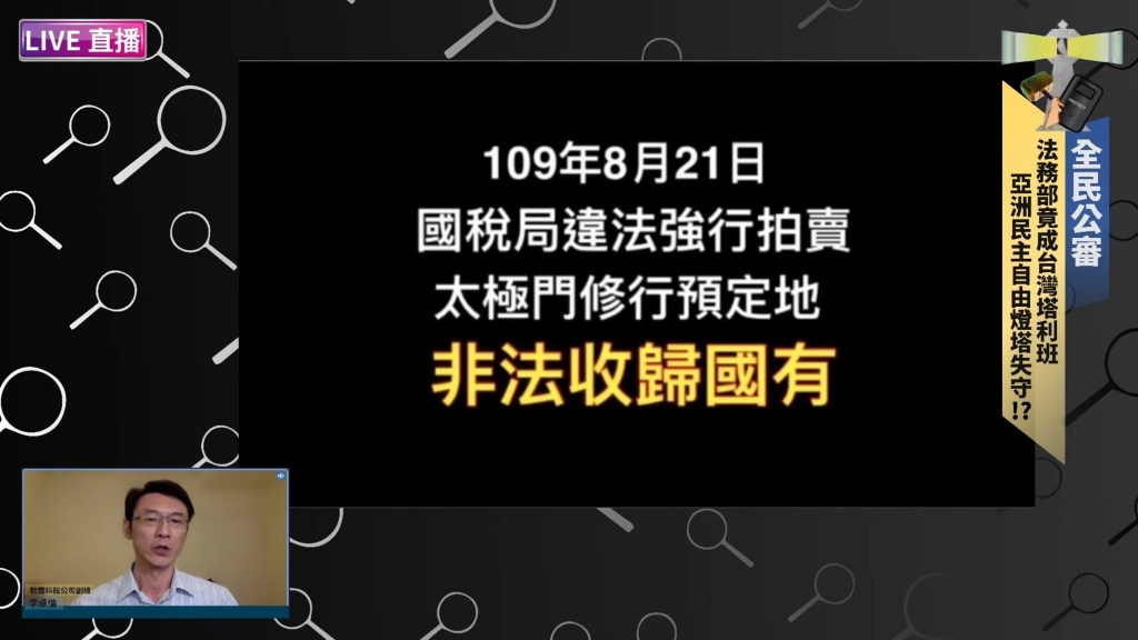 【記者王安之/台北報導】信仰是天賦的基本人權,普世價值,號稱亞洲民主燈塔台灣,在去年8月21日就在國家人權委員會成立第21天,行政執行署竟強行違法拍賣太極門修行道場預定地,並收歸國有,知法犯法,迫害人民信仰自由,引發海內外國際人權及宗教專家學者聲援,上個月華府舉辦的國際宗教自由(IRF)高峰會上也引發熱烈討論。到底是誰一手主導太極門1219事件?案件中又有多少違法?8/21(六)《全民公審》網路直播節目,邀請陳祖祥律師、科技業主管李卓倫、海外太極門弟子Judy Lee現身說法。播出的影片中25年前配合侯寬仁檢察官作偽證的稅務員史越生現身,驚爆當初侯寬仁就是太極門案主導者,而調查局市調處雖明知違法,仍執意要稅務員作偽證。