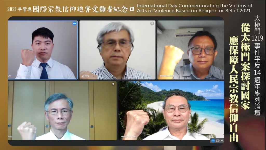 (記者 李蒙/報導)台灣人權只是虛幻的?聯合國/NGO世界公民總會、中正大學財經法律研究中心等團體8月22日舉辦2021年響應「國際宗教信仰迫害受難者紀念日:太極門1219事件平反14週年系列論壇」,從太極門案探討國家應保障人民宗教信仰自由,主辦單位表示,當天適逢華人傳統信仰中元節,也是人們懺悔、贖罪的日子,盼世人良心覺醒,用愛與良心捍衛人權!學者專家指出,國際公約明定宗教、信仰必須獲得絕對的保障,政府應尊重宗教修行團體的根源與本質,呼籲全民覺醒關注、監督法稅改革,政府應依職責做到有效救濟,平反人權迫害案件太極門案,否則人權就是虛幻的。