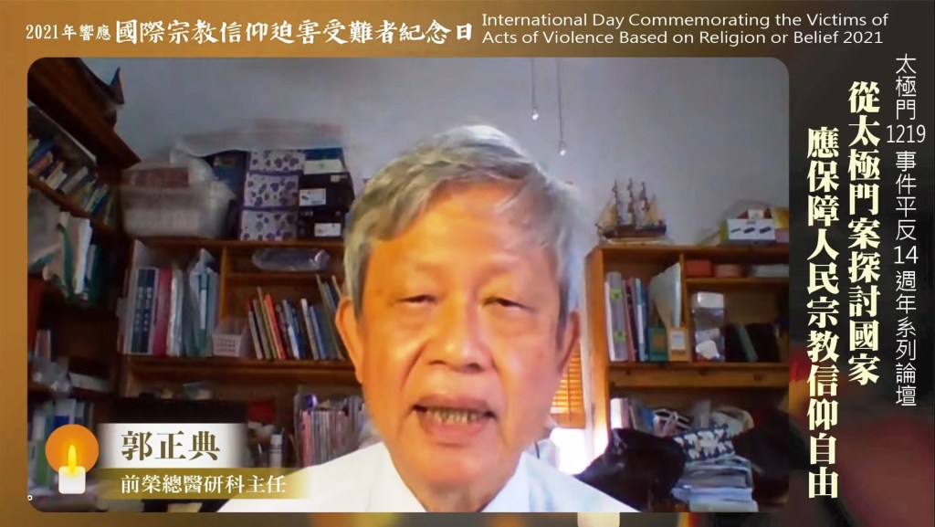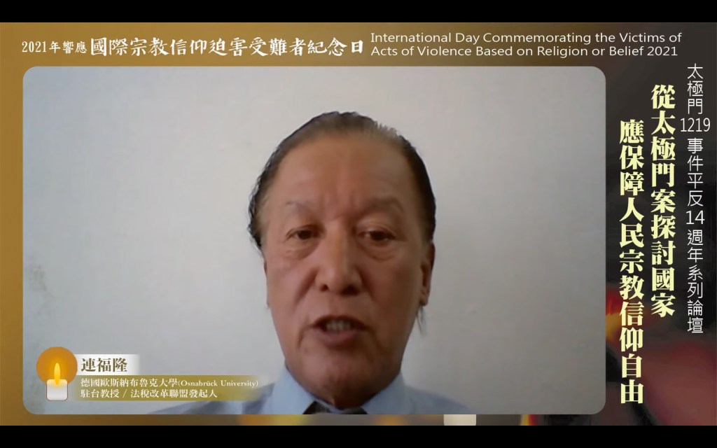 (記者洪大成/台北報導)太極門1219事件,最高法院判決確定無罪無欠稅已14週年。8月22日「國際宗教信仰迫害受難者紀念日」,國內法稅專家指出,正是反思太極門案之意義的最佳時機,被稱為台灣「法稅照妖鏡」的太極門案件,其根源就是信仰自由的迫害。8月22日由聯合國NGO/世界公民總會等二十五個民團舉辦「從太極門案探討國家應保障人民宗教信仰自由」線上論壇(https://youtu.be/DRapCWOhhco),專家學者提出建言,協助台灣成為真正尊重宗教和信仰自由的民主國家。德國歐斯納布魯克大學(Osnabrück University)駐台教授暨法稅改革聯盟發起人連福隆引用《尚書》提到,上天授權給執政者必須守天道,就是要照顧百姓免於受到貪官污吏的傷害,否則上天會讓他崩解或鼓勵人民出來反抗,救脆弱的百姓脫離暴政統治。主辦單位表示,當天適逢華人傳統信仰中元節,也是地官大帝聖誕,懺悔、贖罪的日子,盼官員良心覺醒護衛人權。