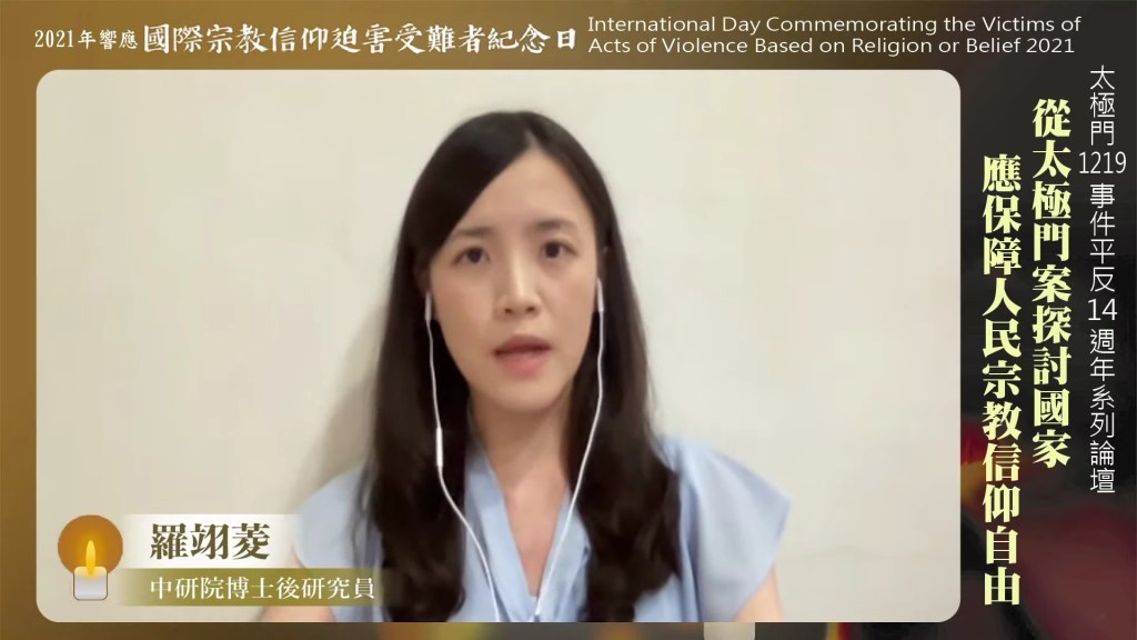 國家研究機構博士後研究員羅翊菱哽咽表示:「回想起25年前,我還只是個國小三年級的孩童,當時我看到新聞不停地播報荒謬的報導,太極門養小鬼、詐欺……,隔天我一如往常地上學去,到了學校被同學笑,穿著練功服走在路上被人指指點點,我覺得好委屈,那段時間對我來說真的是極黑暗、極可怕的時期!」甚至違法官員用非法的手段奪走了太極門修行道場預定地,羅翊菱認為他們奪走的不只是一塊土地,也奪走了修道人的尊嚴,更奪走了民主國家最寶貴的「人權」與「信仰自由」。2021 IRF國際宗教信仰自由高峰會中與會的各國專家學者,每個人都難以置信,也紛紛嚴厲撻伐。她引用高峰會主席Sam Brownback的發言,每個人的宗教信仰自由,在任何地方、時刻都應該得到保障,而政府的作用是要「保護一個人與生俱來為自己的靈魂選擇未來之路的權利」。羅翊菱表示:「師父愛世人的方式,不是要殲滅壞人,而是希望壞人真正良心覺醒,變回好人;喚醒良心,才是真正治本的方式。」她真誠地希望,政府能夠正視發生在台灣的宗教信仰迫害問題,維護每個人的基本權利,依法盡快還太極門師徒清白、還太極門師徒修行聖地,以及解決所有宗教信仰迫害案件。