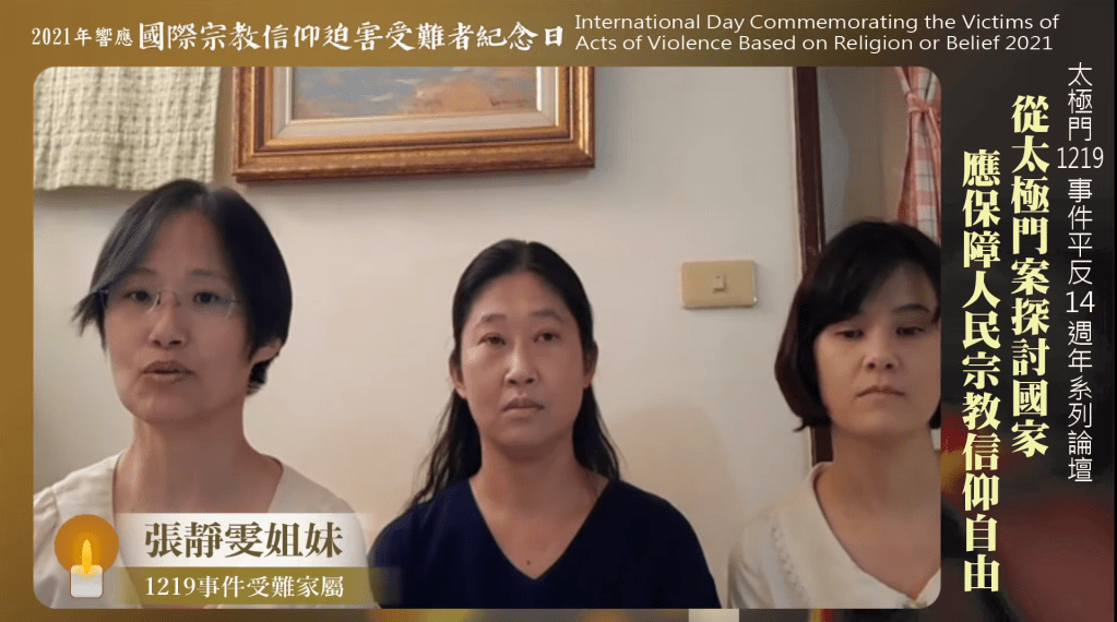 會中播放影片https://youtu.be/8S1MfZJ1YdU?t=2053,1219事件受害家屬Brenda Chen在華盛頓特區2021國際宗教信仰自由高峰會(IRF)相關研討會中,訴說她當年為了擺脫1996年的夢魘,和姊姊分別遠走他鄉,姊姊去了法國,她去了美國,一待就到現在。她父親7年前離世,看不到太極門冤案的平反,遺憾而終。她希望透過此次發聲,獲得國際聲援,並提醒台灣政府,讓無良官員承認錯誤,停止傷害台灣最重要的自由民主人權價值,歸還太極門的修行聖地。