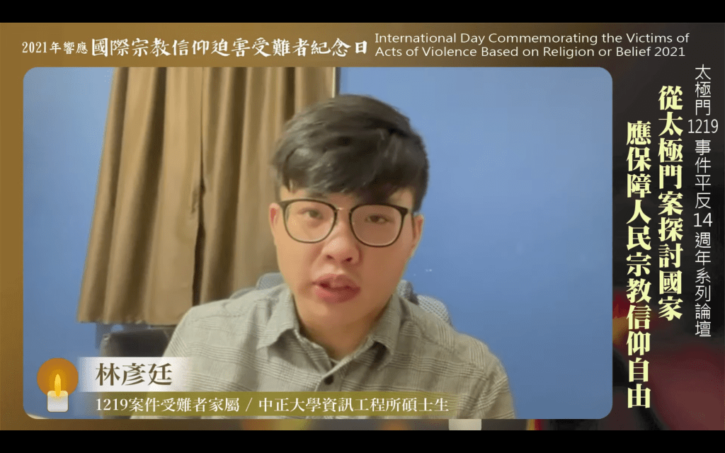 「太極門1219案件對我來說,是這二十多年來,插在我心頭上的針!」受難者家屬、資訊工程所碩士生林彥廷控訴,1996年檢察官侯寬仁帶著大批警調及媒體,違法搜索各地太極門道館和師兄姊住家,抓走父親林世明,威脅要監視家人,恐嚇要把他關起來,用羈押脅迫逼父親說出對太極門及師父不利的證詞,甚至上媒體放話要再抓更多人,讓純樸耿直的父親受莫大污辱,在林彥廷小學二年級時就抑鬱而終。林彥廷很小就失去了父親,成單親家庭,頓失經濟支柱,高中開始就辛苦半工半讀。