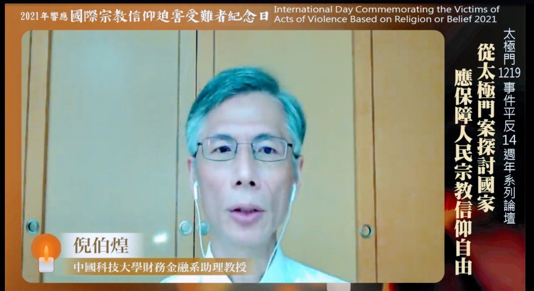 【記者陳嘉玲/台北報導】太極門假案在國際宗教自由高峰會上受到高度關注,科技大學財務金融系助理教授倪伯煌於2021國際宗教信仰迫害受者紀念日線上論壇中表示,太極門案不只是思想信仰受到迫害,政府更須要檢討的是司法制度、稅捐稽徵、行政救濟以及除錯機制。他呼籲:「建立有效救濟是政府的責任與義務,沒有做就是違反國際人權兩公約,也違反憲法,保障人權是要落實的,不是拿來當口號用的。」