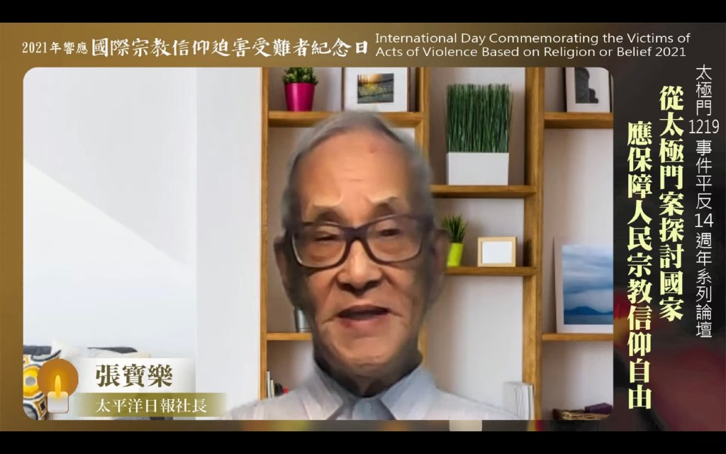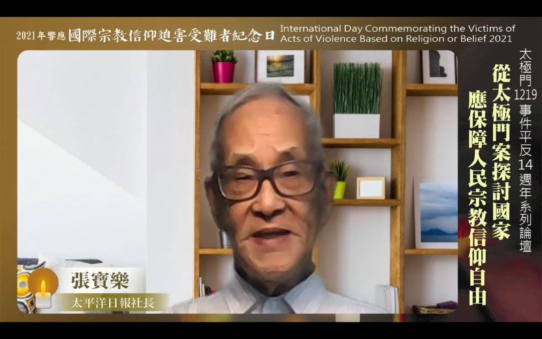 太平洋日報社長張寶樂表示,宗教信仰自由、言論自由不可被剝奪,這是法國哲學家盧梭提倡的「天賦人權」;但歷史證明,天賦人權要靠不斷爭取奮鬥才能得到。太極門冤案不是偶然,政府在政策上常常沒有顧到老百姓,雖歷經好幾屆不同黨派執政,但都沒有完全反省;一天不平反,老百姓反抗的情緒、抗爭的情緒不會停止。張寶樂認為,太極門不是在為自己爭取利益,「沒有一個領頭來做的話,其他老百姓誰敢?」他指出,今年是監察院國家人權委員會成立一週年,應該要有一個指標性的動作,就是平反太極門冤案,如此國家人權委員會的歷史價值才會彰顯。