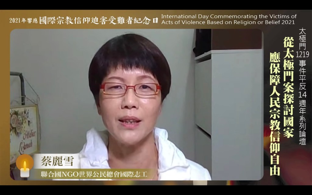 【記者王建民/綜合報導】聯合國/NGO世界公民總會等25個團體響應聯合國「國際宗教信仰迫害受難者紀念日」,8月22日共同舉辦線上論壇,探討受到國際關注的太極門案遭受的信仰自由與人權迫害。今年是太極門案獲最高法院判決確定無罪、無欠稅第14週年,但這場迫害並未終結。與會各界呼籲國家人權委員會盡速平反太極門案,為台灣法治立下里程碑。