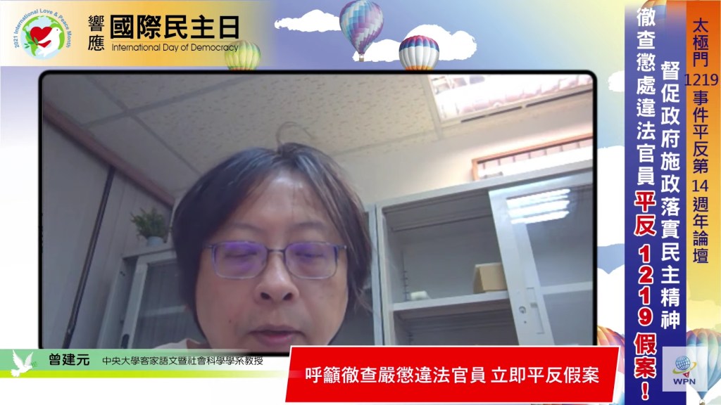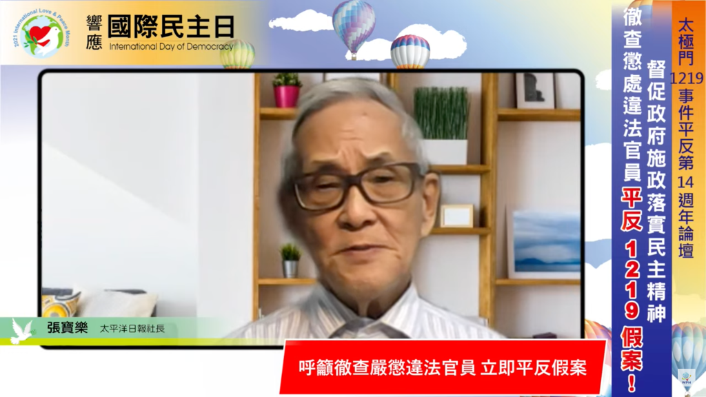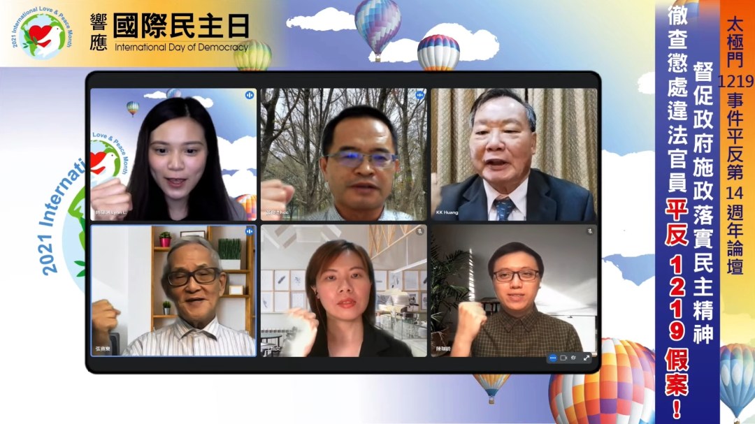 【記者廖旻姍/台北報導】為響應聯合國國際民主日,督促政府落實民主精神,9月15日晚間由聯合國/NGO世界公民總會、聯合國/NGO世界公民總會(台灣)、平反1219行動聯盟、法稅改革聯盟、稅改青年陣線、太極門氣功養生學會、WPN世界民報、正大出版社共同舉辦「響應國際民主日:太極門1219事件平反第14週年線上論壇」(https://www.youtube.com/watch?v=VrtTBCPc174),邀請專家學者體檢台灣的民主法治。台灣政府縱容少數違法官員製造假案,讓人民生活苦不堪言,而違法官員逍遙法外,沒有被懲處反而升任更高職位,掌握大權,更令人民痛心。專家學者共同呼籲台灣政府應當立即平反太極門假案。
