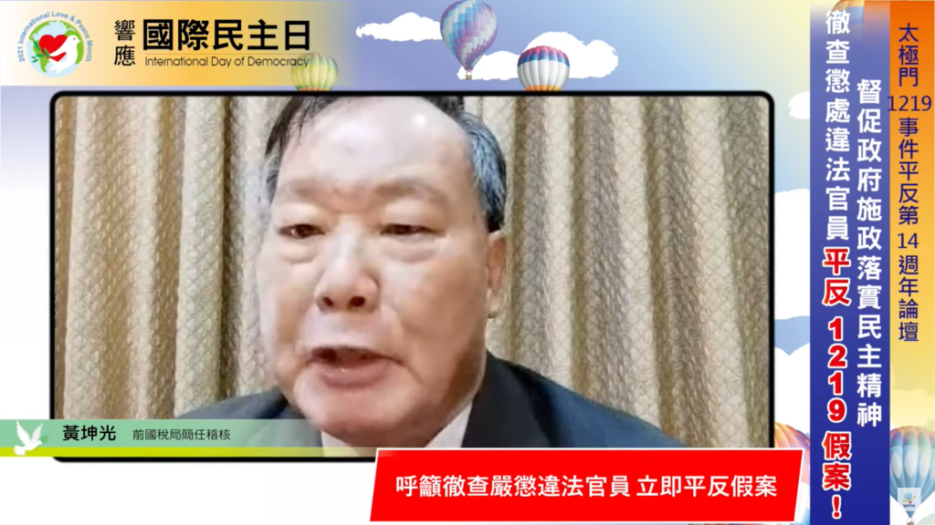 前國稅局簡任稽核黃坤光指出,太極門案所遭受到的非法課稅、違法徵收,是民主政體裡面最嚴重的人權迫害。太極門案檢察官創下多種反常:第一,僭越財政部與法務部執掌,破壞行政權分官設職功能,污辱了檢察官及稅務機關查審人員職能。檢察官竟任意指揮調查,包括請國稅局人員去作證,完全違反法治。連違法收入和合法所得不能並存,一事不能兩罰,都搞不清楚的胡亂起訴。第二,依舉證法則及經驗法則,查核銀行資金往來,未依所得稅法第83條之1規定報經財政部核准。最離譜的是,查無犯罪證據,卻自行介入偽證之採製和採納,並且在民主法治時代,以養小鬼怪力亂神入於偵查文書,很明顯是極其邪門的栽贓枉法。第三,非法課稅額自始不應存在,六個年度同一事實,卻獨留81年度不予更正為零,原因在他們已經陸續領有個人獎金,怕全部更正為零會有冒領獎金罪之嫌,但這正是坐實其違法徵收。黃坤光強調,無論是群體國家或個體人民,要進步必須保有自省及糾錯的能力,豈能知錯不改?簡直無可救藥!