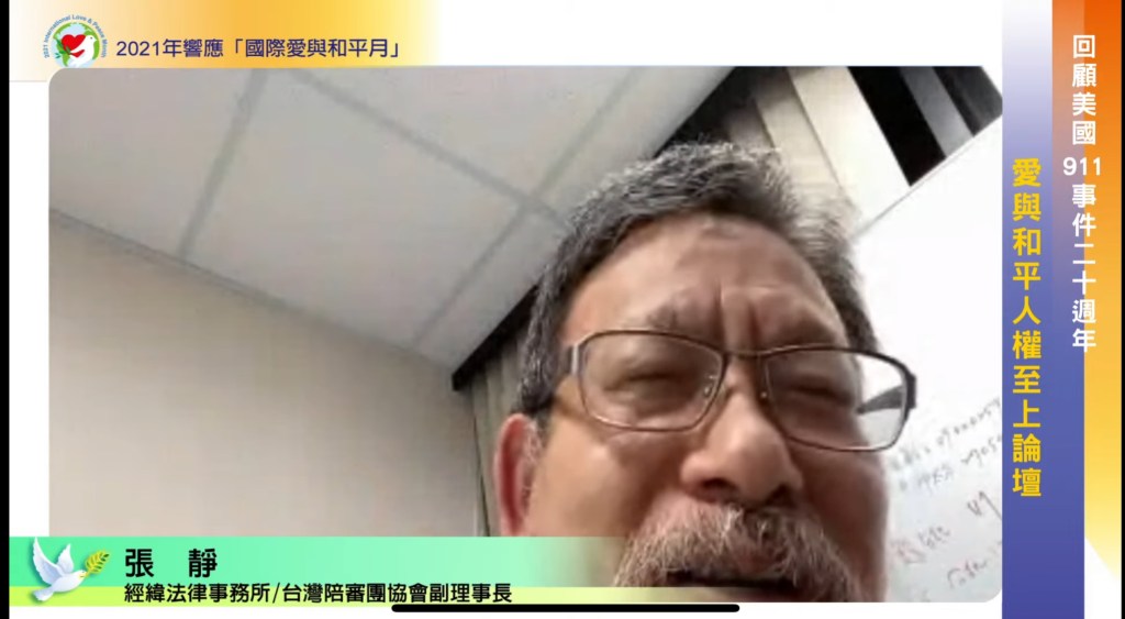 【記者廖旻姍/台北報導】美國紐約911恐怖攻擊事件屆滿20週年,恐攻讓全球陷入恐懼不安,然國家暴力更甚於恐怖攻擊,讓人民猶如芒刺在背。9月11日晚間聯合國/NGO世界公民總會等民團舉辦「回顧美國911事件二十週年-愛與和平人權至上論壇」,台灣陪審團協會副理事長張靜律師語重心長地說,面對暴力事件,奢望政府怎樣都沒有用,唯一有用的是人民起來換政府,只有換政府才有用。他也提到要解決太極門的問題很簡單,只是總統的一句話而已,難道總統的這一句話這麼難嗎?