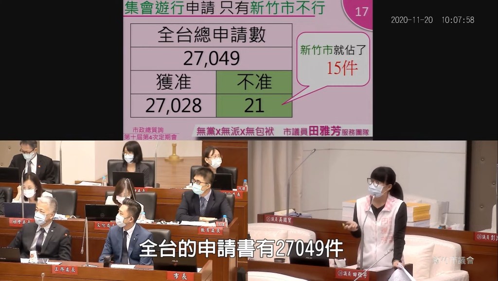 新竹市議員田雅芳在節目中回憶,919竹北事件當天,她與陳志龍教授在交談時,警方竟然偷渡將黃姓志工媽媽移送地檢署,她感到非常不可思議,她認為黃姓志工媽媽確實沒有任何違法行為,只是在路邊舉牌而已,況且警察找到她當下並沒有舉牌,還是警察翻地上其他人的包包拿出來的。9月23日她陪同法稅改革聯盟到地檢署,為被違法逮捕的黃姓志工媽媽提告,竟然被警察圍擋不讓她陪同,後來要求她脫掉議員的背心才可進去。田雅芳驚呼非常不可思議!過去陪民眾到地檢署二十多次,從來都沒被要求脫掉背心,可以看到他們行政不中立及違法擴權的程度!而且2020年全台只有21件集會遊行不通過,法稅改革聯盟於新竹申請15件集會遊行,都不被允許,田雅芳表示,本來只須在轄區派出所申請即可,但她看了公文指出,新竹市政府一下說是工務處的事,一下又推給警察局,最後還是否決了申請,很明顯地是違法行政行為!