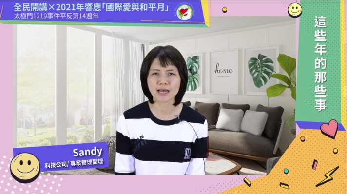 Sandy在科技公司擔任專案管理副理,曾在2001年9月跟隨太極門親善文化訪問團到美國加州參加Cupertino市的中秋節活動,透過文化交流傳遞世界一家的願景,她很感恩能與家人一起在太極門練氣修心進而參與公益。即使太極門受冤案所累,太極門掌門人洪道子博士仍引領弟子持續在國內外推動愛與和平的良心文化。Sandy以美國重大人權案件為例提到,2019年濫權起訴的檢察官伊凡斯(Doug Evans)遭國家求償支付50萬美元的冤獄補償金;反觀台灣,無辜被侯寬仁羈押的太極門師徒,國家的冤獄賠償卻是全民買單。她長年參與推動法稅改革,希望以切身之痛來幫助更多遭受不公義磨難的台灣人民,希望政府不要一錯再錯,立即更正錯誤,歸還太極門修行聖地。